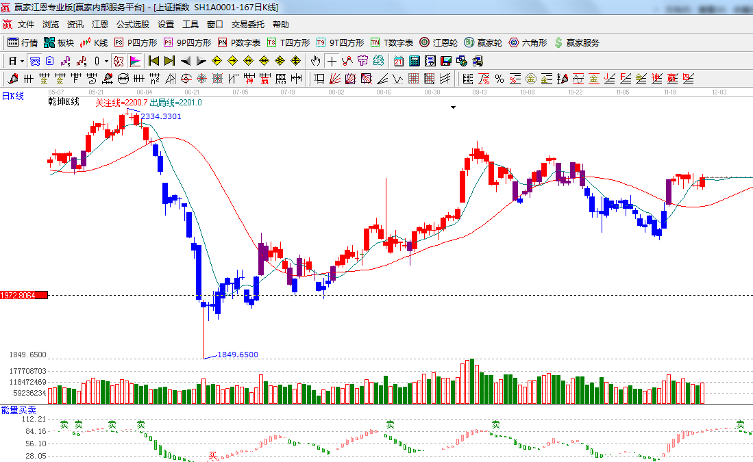 ★依據(jù)贏家江恩系統(tǒng)乾坤K線提示: 收盤價(jià)在藍(lán)色短期出局線上,繼續(xù)看多;