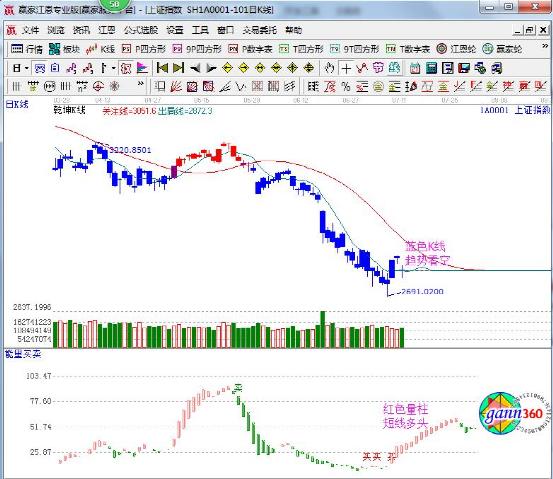 ☆依據(jù)贏家江恩理論系統(tǒng)乾坤K線提示:藍色K線,波段趨勢仍為空。