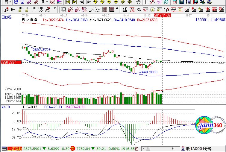 滬指跌0.68%,報(bào)收2641點(diǎn);深成指跌0.50%,報(bào)收7752點(diǎn);創(chuàng)業(yè)板跌0.25%,報(bào)收1345點(diǎn)。從盤面上看,黃金、ST板塊、5G、殼資源、紡織制造、生物制品等板塊領(lǐng)漲;自由貿(mào)易港、證券、碳纖維、在線旅游、西安自貿(mào)區(qū)等板塊領(lǐng)跌。滬股通凈流入18億,深股通凈流入4.7億。相應(yīng)的極反通道指標(biāo)的支撐壓力提示,如下圖所示: