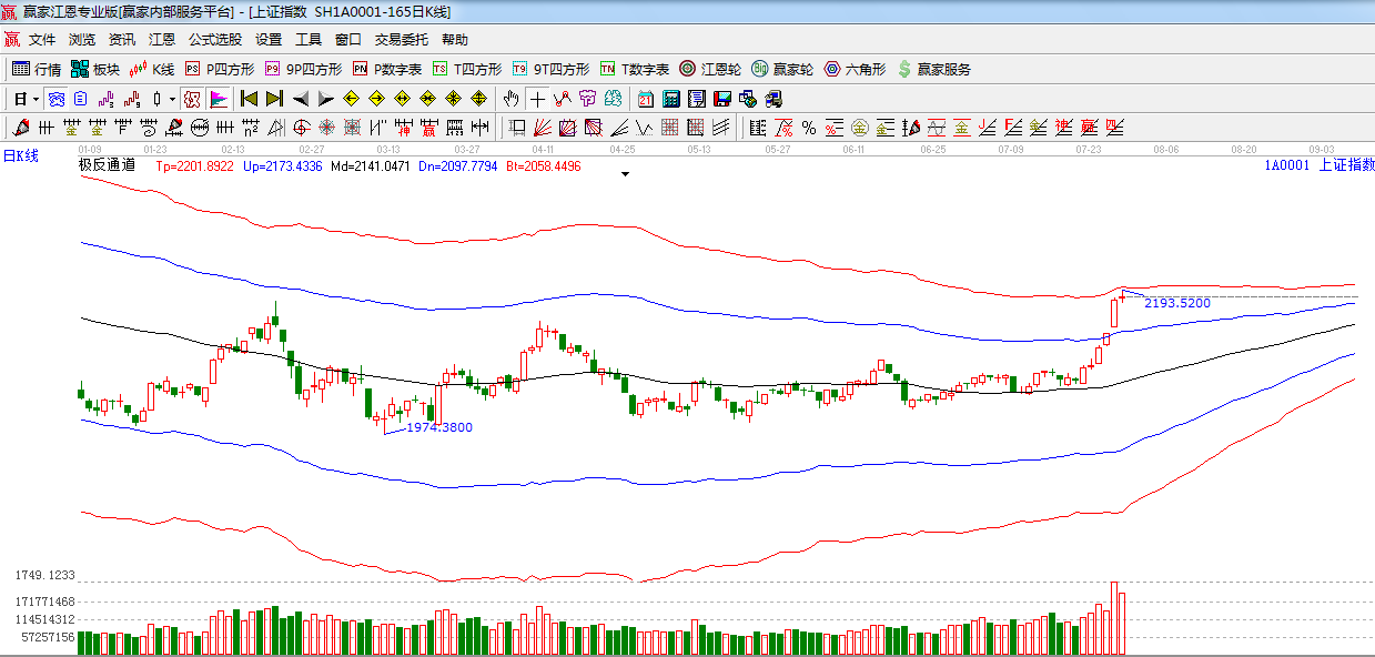 盤面上,個(gè)股板塊漲多跌少,航天軍工,國產(chǎn)軟件,鋰電池,倉儲(chǔ)物流等板塊表現(xiàn)活躍,藍(lán)籌股出現(xiàn)分化,鋼鐵、有色、煤炭等出現(xiàn)不同程度的回調(diào),只有房地產(chǎn)和券商板塊上漲,今日題材股表現(xiàn)好于權(quán)重股,指數(shù)上攻動(dòng)能在衰減,而且指數(shù)也逼近極反通道紅色外軌阻力線附近,預(yù)計(jì)短期大盤將沖高回落。