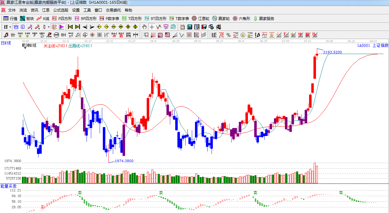 ★依據(jù)贏家江恩系統(tǒng)極反通道提示:逼近紅色外軌阻力線,震蕩收星,預(yù)計(jì)短期大盤將沖高回落。